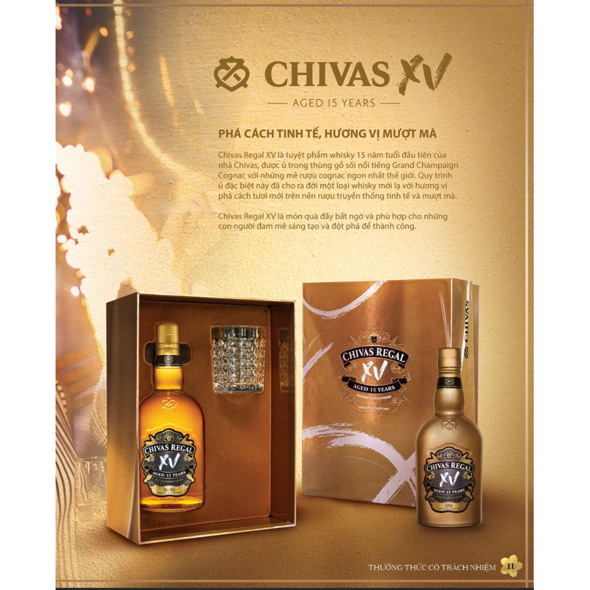 Rượu Chivas XV ( Rượu Chivas 15 năm ) hay rượu chivas 15 năm tuổi là sản phẩm mới được ra mắt của nhà Chivas Regal vào năm 2018 , đây là loại rượu được chọn lựa ủ lần cuối cùng với thùng gỗ Grande Champage của vùng Cognac nước Pháp , nó cho ra một hương vị rượu Whisky độc đáo , nó cho ra hương vị xa hoa của trái cây và vị ngọt tuyệt vời.Với ảnh hương tinh tế của thùng gỗ sồi Cognac tại pháp làm cho nó không giới hạn cách để thưởng thức hương vị rượu cho bạn những trải nghiệm tuyệt vời của các bữa tiệc đêm.