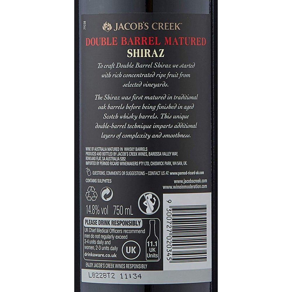 Thời gian ủ trong thùng gỗ sồi Pháp và Mỹ đã mang lại hương khói và vani nhẹ nhàng cho rượu. Vang nhập Jacob's Creek Double Barrel Shiraz thích hợp với các món bò phi lê cao cấp, các loại thịt nướng béo ngậy.