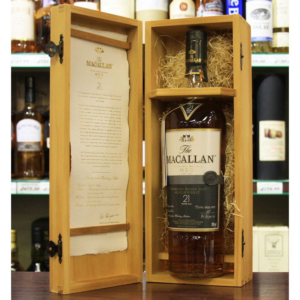 The Macallan 21 Fine Oak - Loại Single Malt huyền thoại này được trưởng thành qua ba giai đoạn trong 3 loại thùng tôn-nô khác nhau trong vòng ít nhất 21 năm, là sự kết hợp hương vị vị phong phú qua 3 giai đoạn: loại thùng gỗ sồi hiếm có của Châu Âu (Exceptional Oak Cask), thùng gỗ sồi Tây Ban Nha dày dặn với hương Sherry (Spain Oak Cask) và cuối cùng là thùng gỗ sồi của Mỹ với hương đặc trưng của Sherry và Bourbon (American Oak Cask)